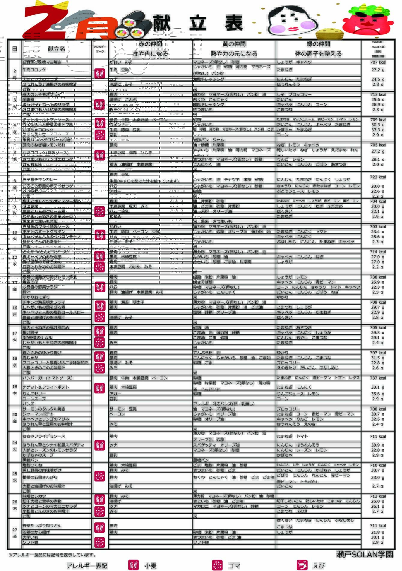 2月の献立・成分表