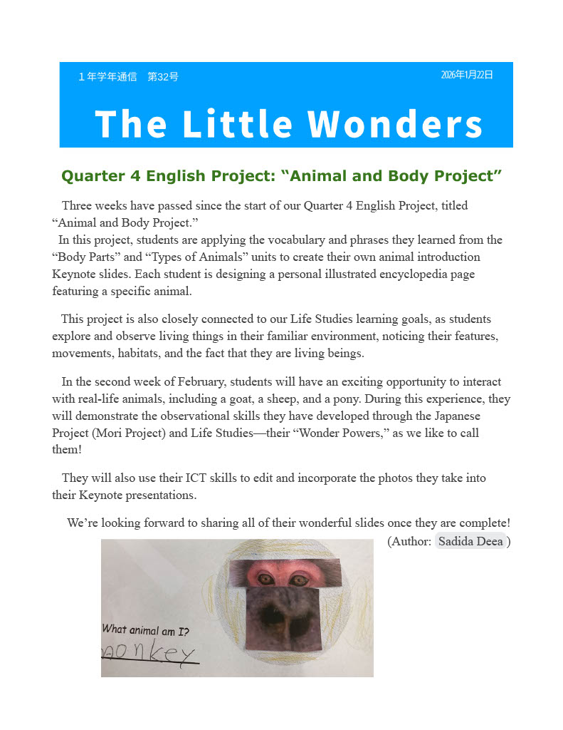 1年生学年通信 The Little Wonders. No.32〜Animal and Body Project〜