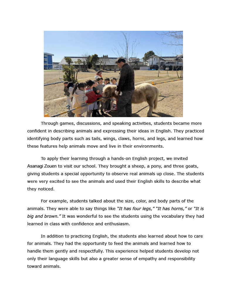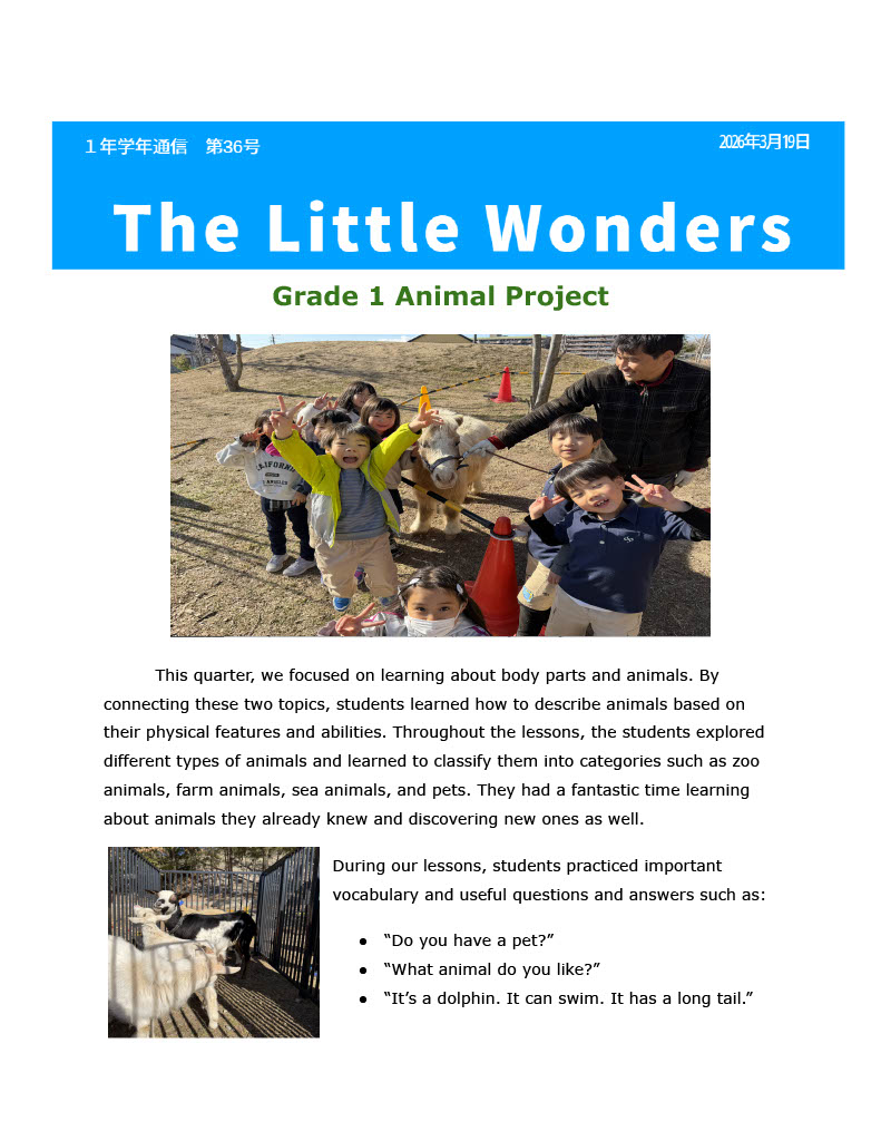1年生学年通信 The Little Wonders. No. 36 ~Animal Project~