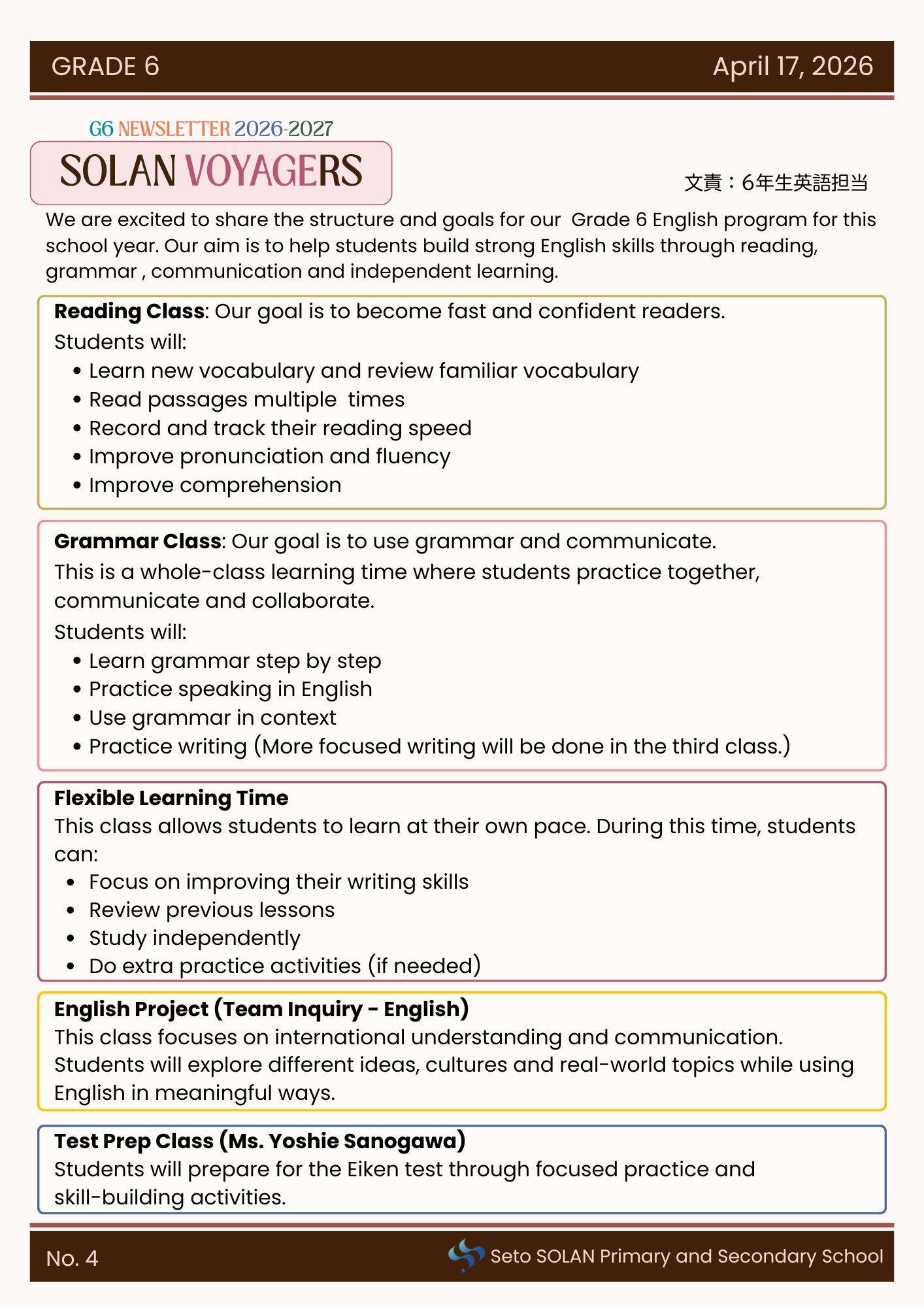 6年生学年通信No.4「Grade 6 English」